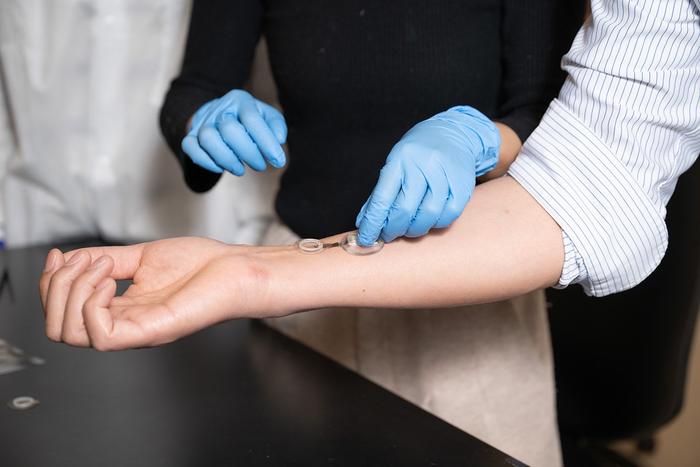 Image: A smart bandage that promotes healing and monitors wound conditions is applied to the skin of a human volunteer.